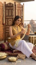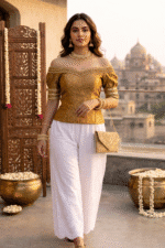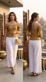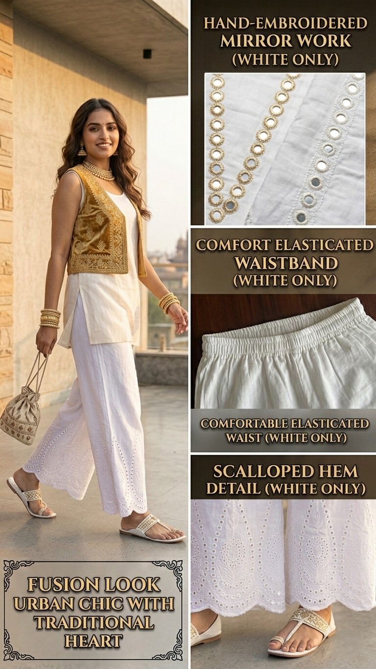 Elevate your ethnic style with this elegant white palazzo featuring intricate mirror work embroidery and a stylish scalloped hem. Designed with a comfortable elasticated waistband, it offers a perfect blend of tradition and modern comfort—ideal for festive, casual, and fusion wear looks.