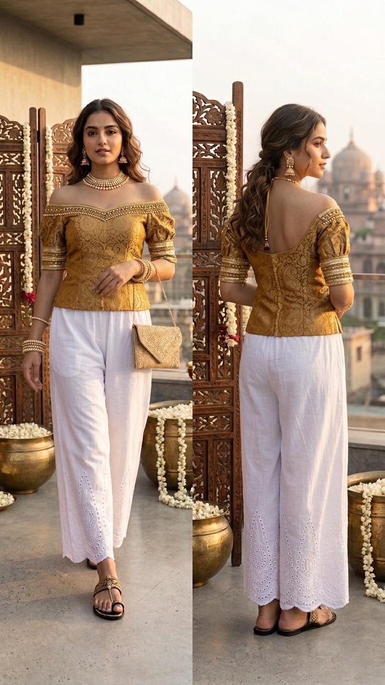 Tags: embroidered ethnic wear, festive palazzo, mirror work palazzo, scalloped hem pants, white palazzo, women ethnic bottom