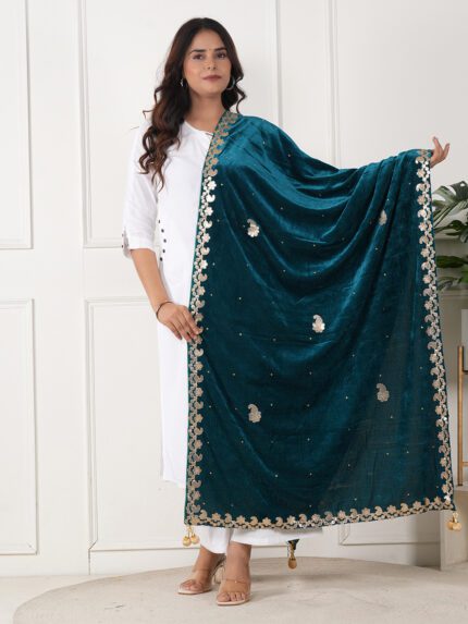Geometric Embroidered Gotta Patti Dark Green Silk Dupatta