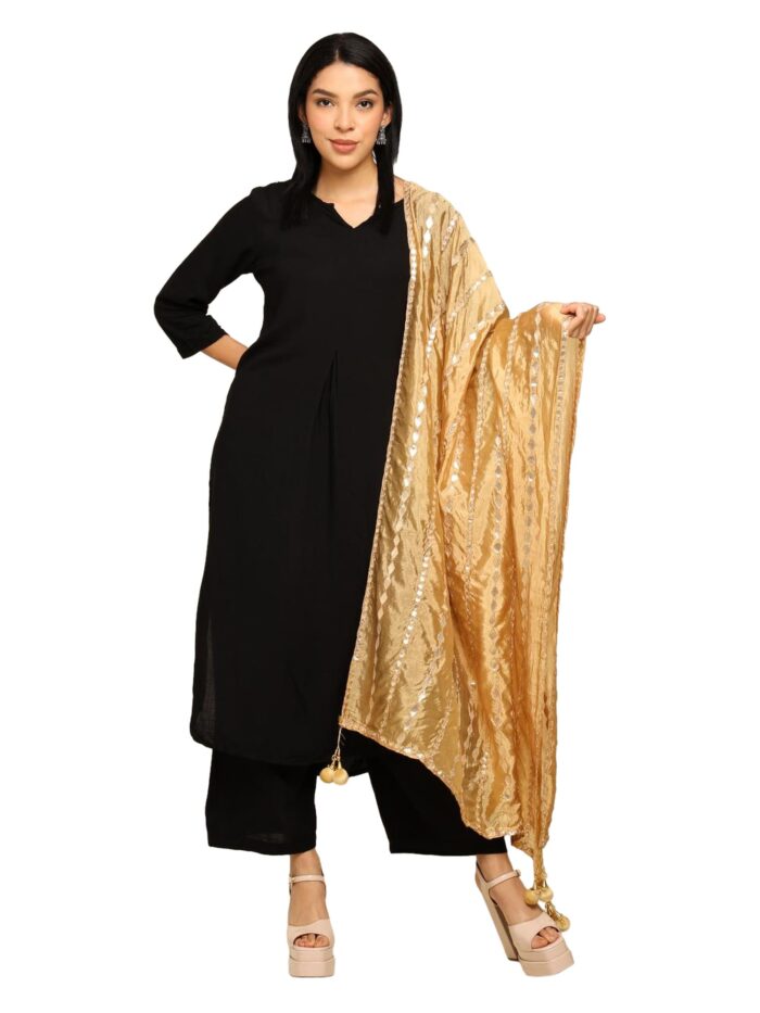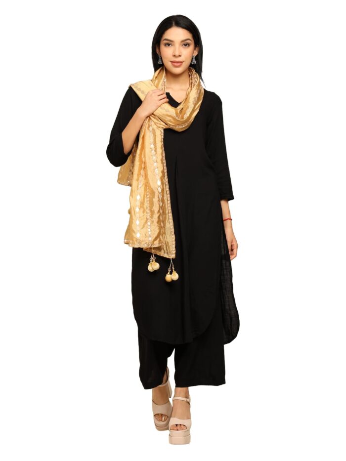 Add a royal touch to your ethnic collection with this exquisite Geometric Embroidered Gotta Patti Silk Dupatta in a luxurious golden shade. Designed to reflect traditional artistry with a modern appeal, this dupatta is a masterpiece that brings together intricate craftsmanship and fine fabric.