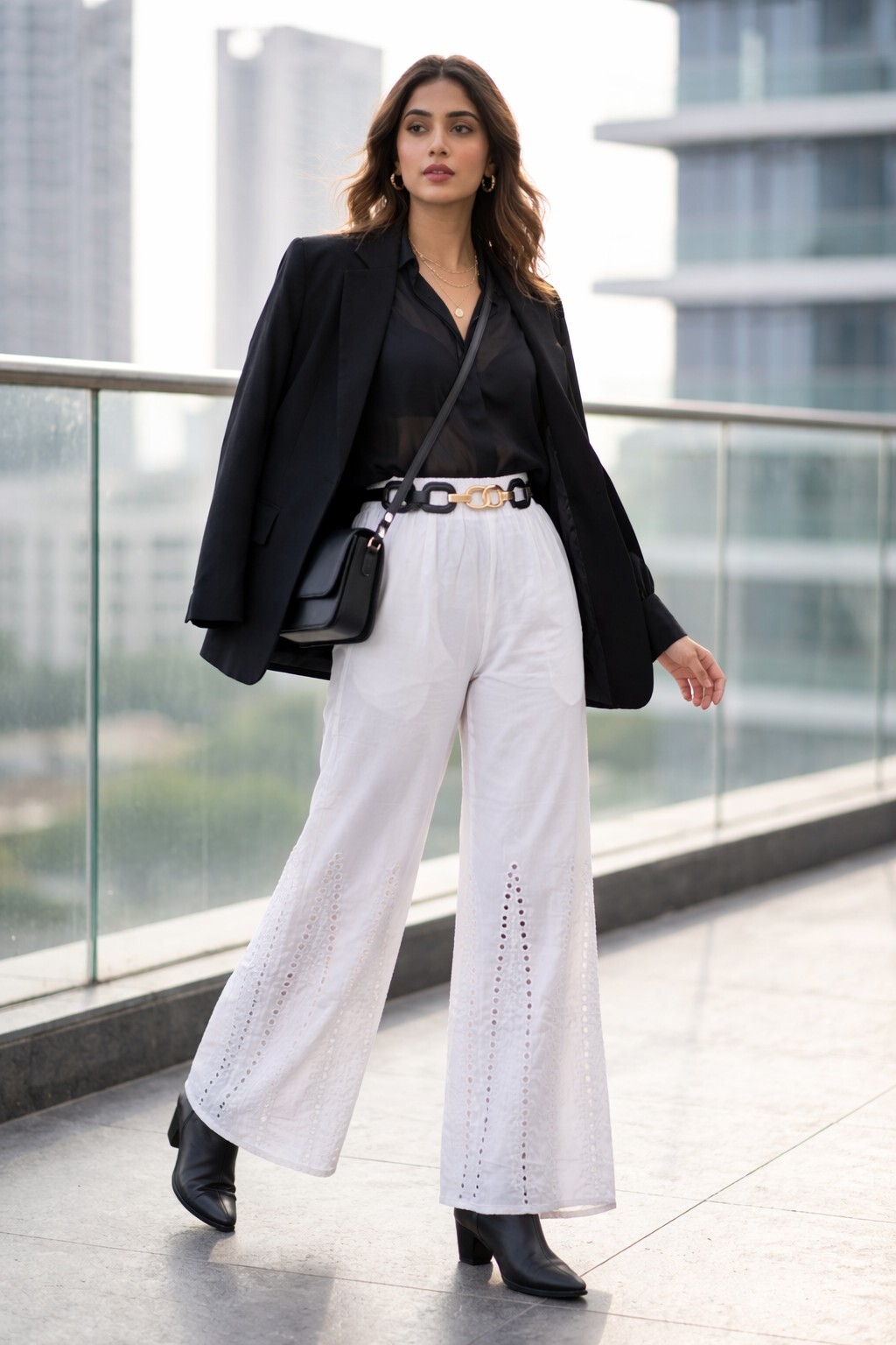 Ethereal White Wide-Leg Palazzo with Intricate Chikankari-Style Lace (Free Size)