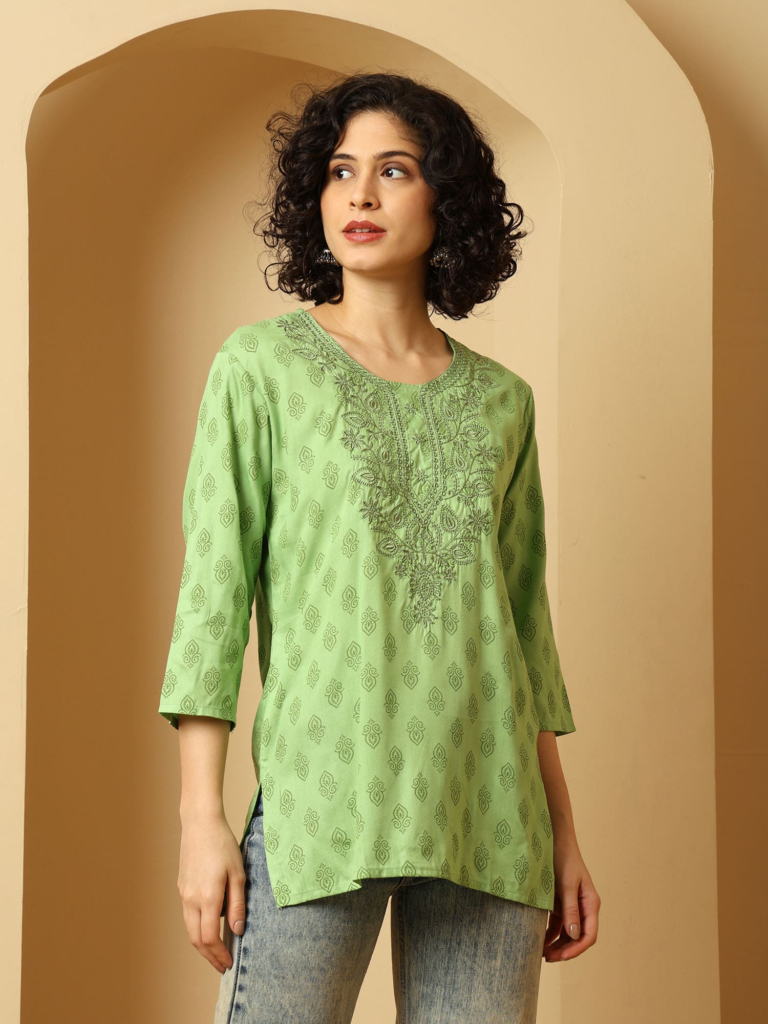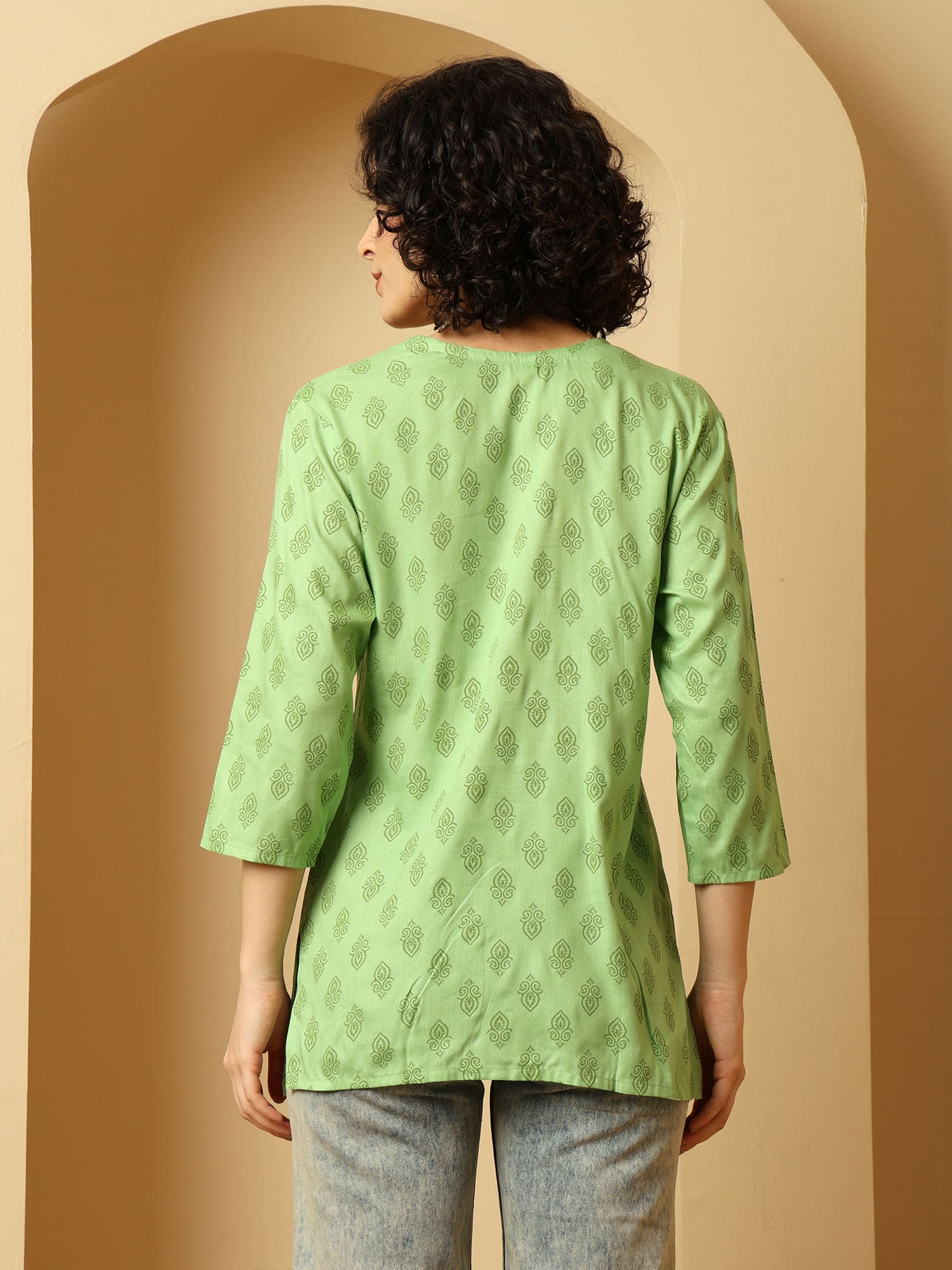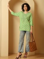 Urban Kanya Green Cotton Embroidered Short Kurti – Elegant Daily Wear