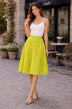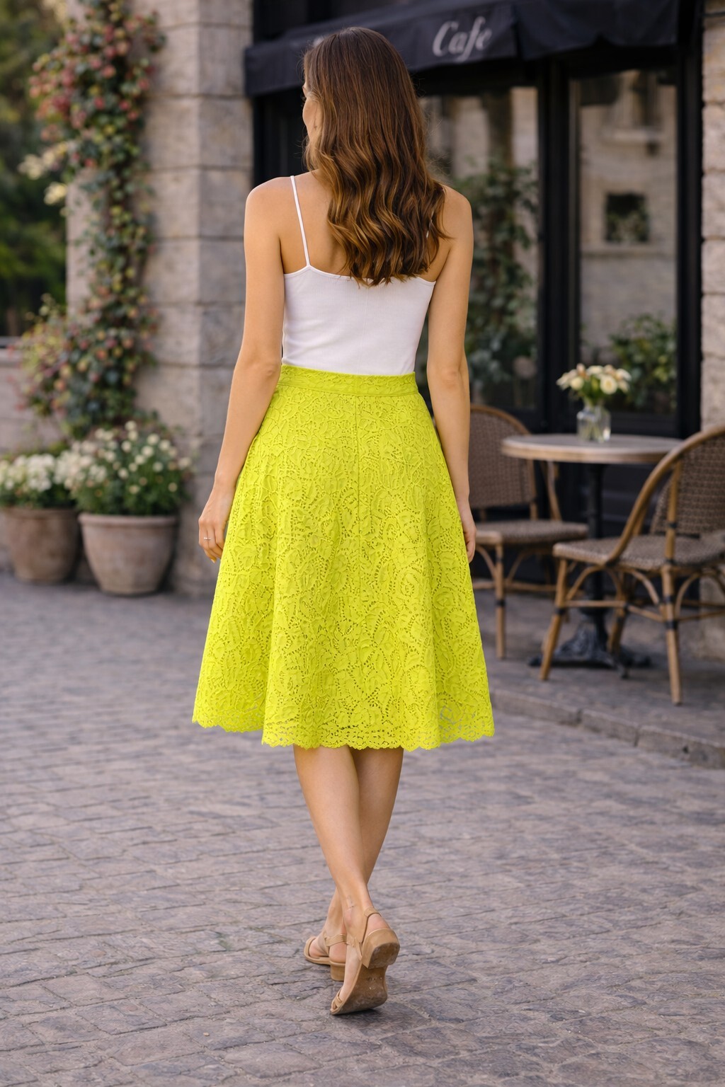 Elegant and versatile, this Lime Green lace A-line skirt features a flattering high-waist fit with delicate floral patterns and a scalloped hem. Perfect for casual outings, brunch dates, and semi-formal occasions.