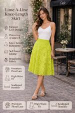 Home Skirt Urban Kanya Women Lime Green Floral Lace A-Line Knee-Length Skirt | High-Waist Elegant Midi Skirt with Scalloped Hem | Summer Casual & Party Wear