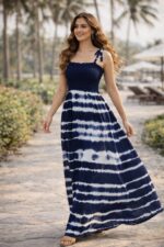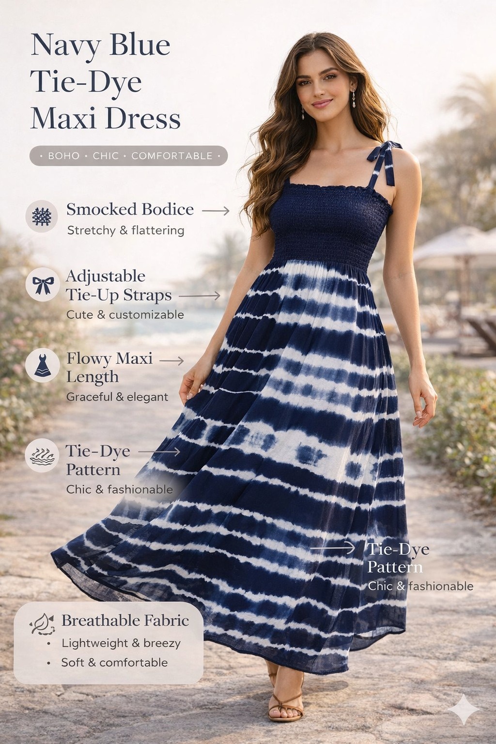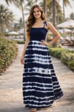 Step into effortless elegance with this beautifully crafted navy blue tie-dye maxi dress. Designed to blend comfort with modern style, this dress features a fully smocked bodice that offers a snug yet flexible fit, enhancing your natural silhouette.