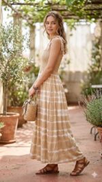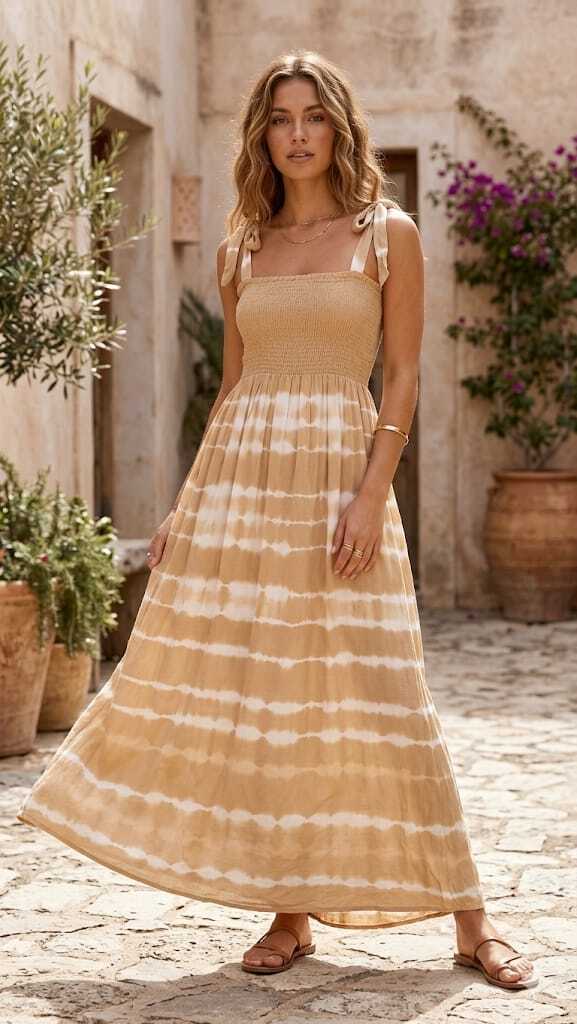 Embrace understated elegance with this beautifully designed beige tie-dye maxi dress, crafted for modern women who value both comfort and style. The dress features a fully smocked bodice that provides a flattering, stretchable fit, enhancing your silhouette while ensuring ease of movement.