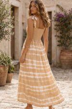 The soft beige tone combined with a subtle tie-dye pattern creates a sophisticated yet relaxed aesthetic, making it ideal for beach vacations, resort wear, brunch dates, or casual day outings. The adjustable shoulder tie-up straps add a delicate feminine detail while allowing a customizable fit.