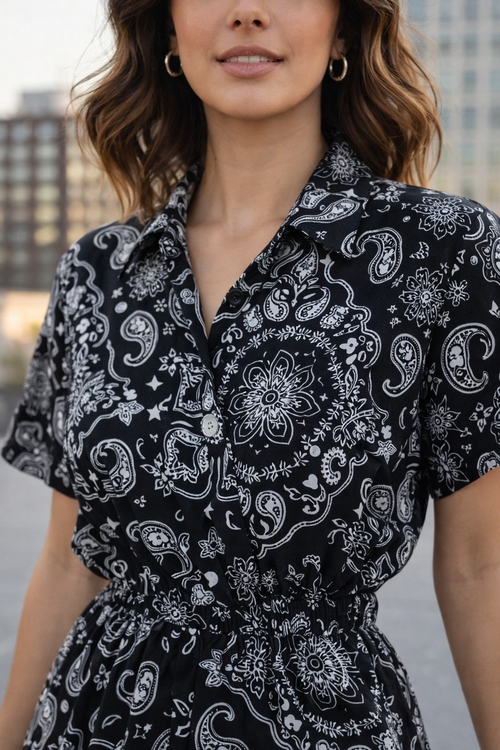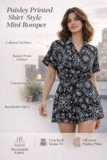 Turn heads with this stylish black paisley printed playsuit featuring a shirt-style collar and adjustable waist tie-up. Comfortable, trendy, and perfect for casual outings or street-style looks.
