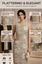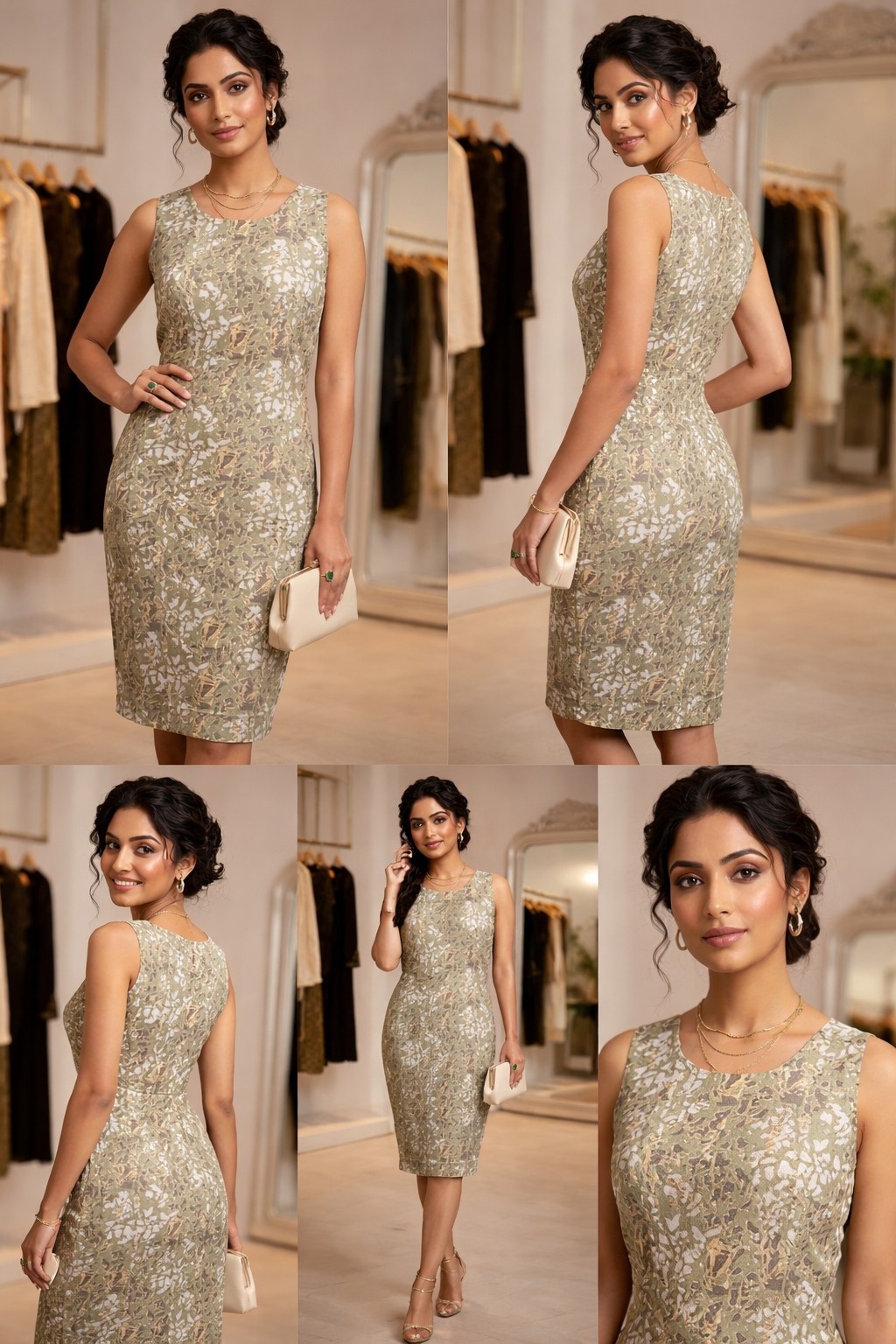 Crafted from premium quality fabric, it offers a comfortable yet structured fit, ensuring you look polished throughout the day or night. The knee-length cut and classic round neckline create a balanced, sophisticated look that works perfectly for parties, evening events, and festive celebrations.