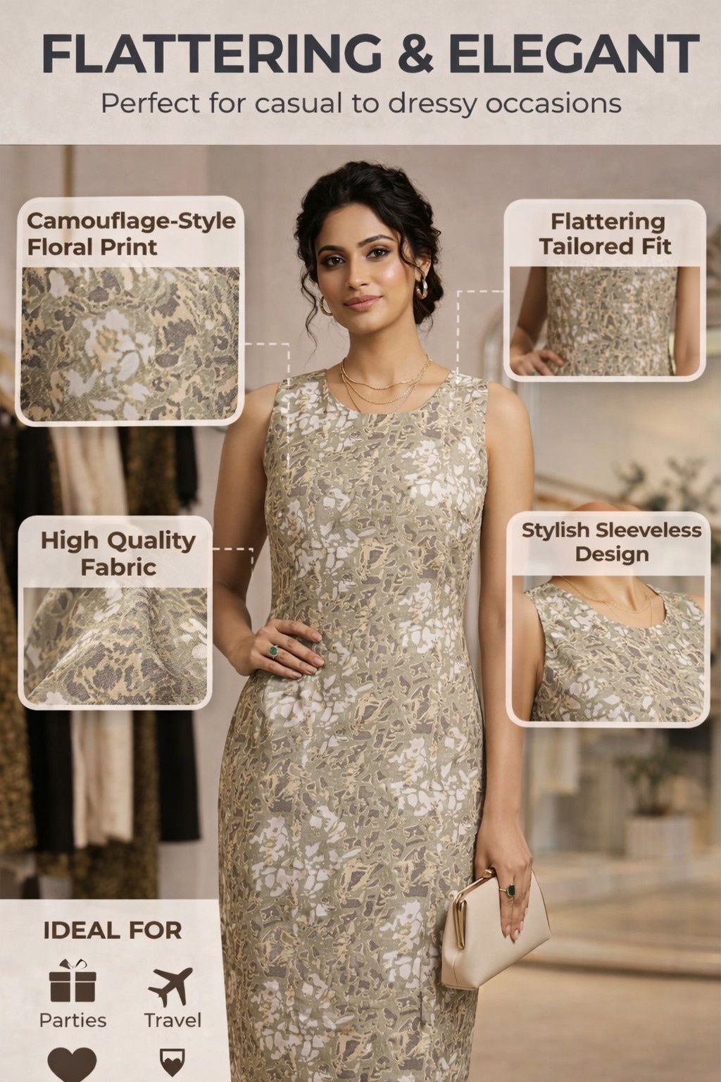 Elegant and figure-flattering, this gold-toned sleeveless bodycon dress features a sophisticated all-over textured pattern and a sleek knee-length silhouette. Perfect for parties, evening events, and special occasions, it adds a touch of glamour to your wardrobe while ensuring a confident, stylish look.