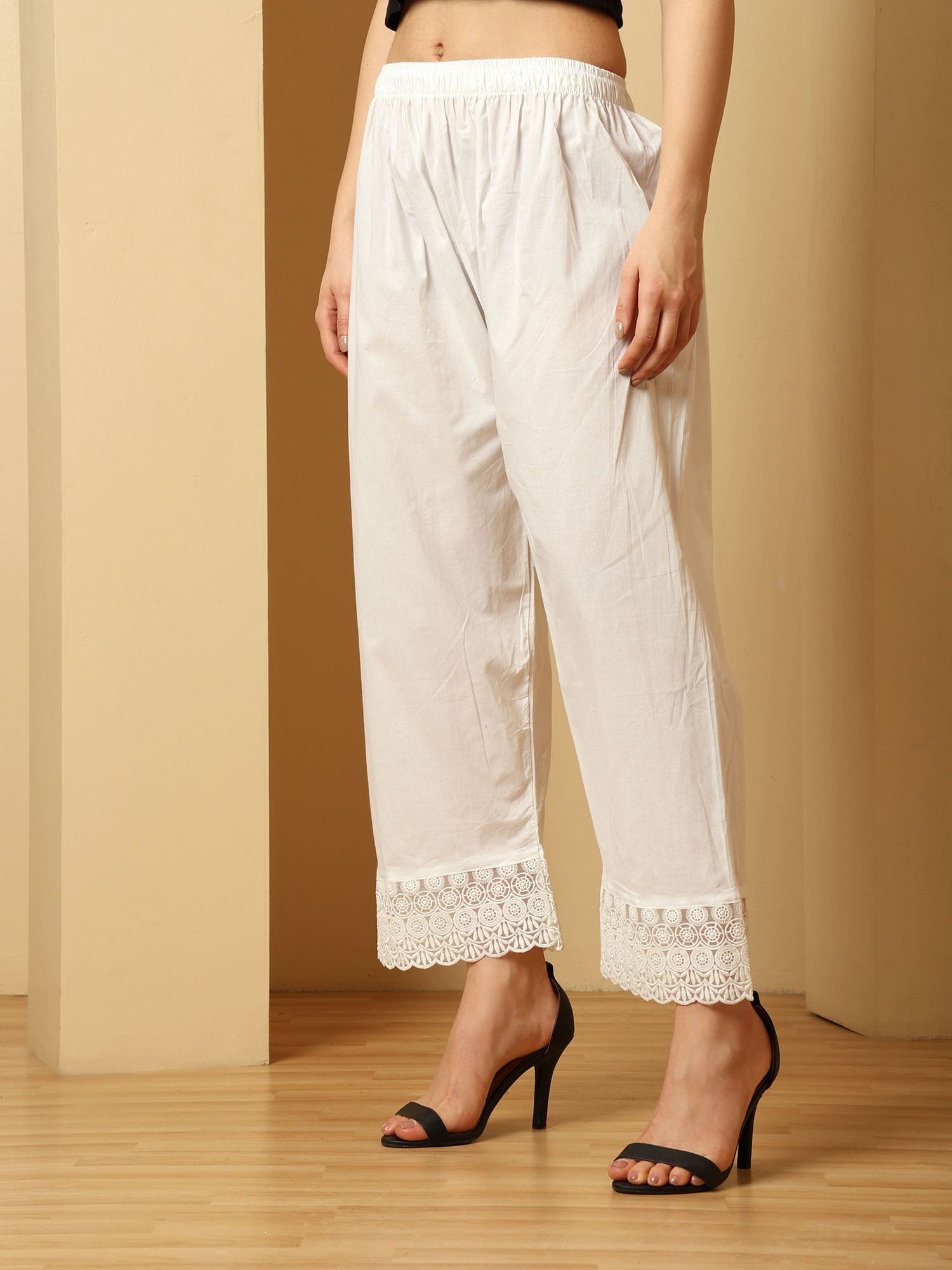 Women White Cotton Palazzo with Geometric Embroidered Lace Hem | Straight Fit